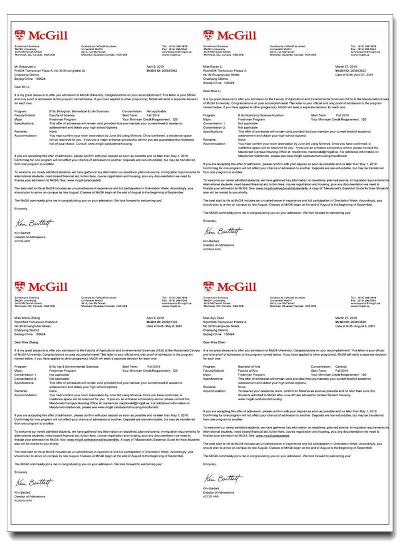 截至2019年6月9日,我校中加国际班第六届毕业生106名同学共收到海外大学录取通知书524封。其中,加拿大大学470封,澳大利亚大学44封,英国大学8封,新西兰大学2封。共计79名学生获得大学奖学金,单个学校较高奖学金金额20000加元。录取结果统计如下: